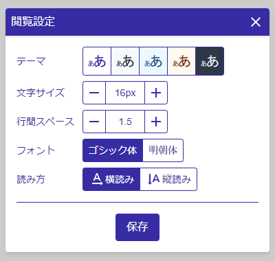 長編作品の場合、本文のページではブックマークの登録、しおりの挿入のほか、歯車ボタンを押していただくことで、文字組み・文字サイズ・配色・フォント・行間スペースを、お好みの読書スタイルを設定することもできます。