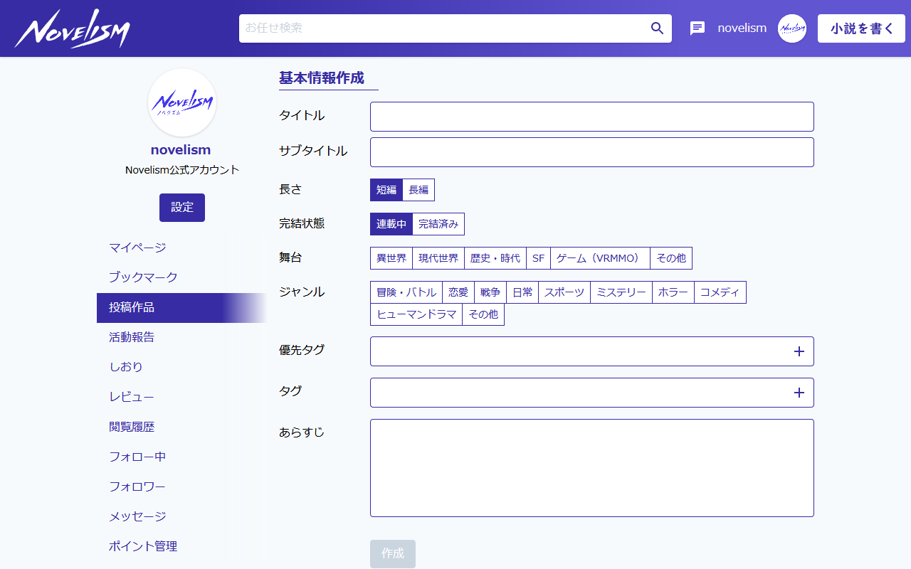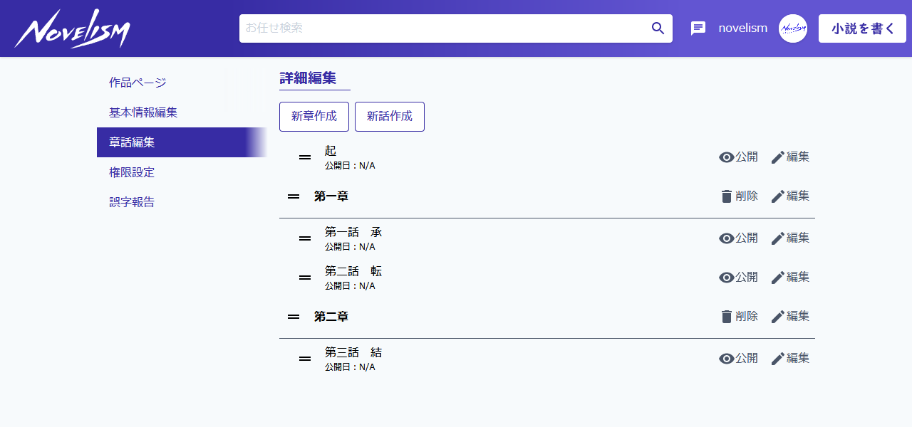 「新章作成」では作品の区切りに応じてお好みで章を設定を、「新話作成」では実際に作品の本文の執筆をすることができます。