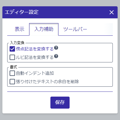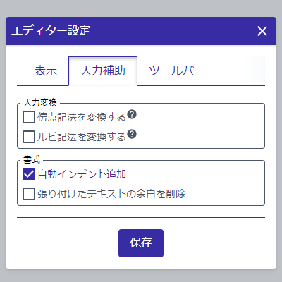 「自動インデント追加」にチェックを入れていただきますと、本文入力時に改行するたびに自動的に文頭の全角スペースが追加されます。