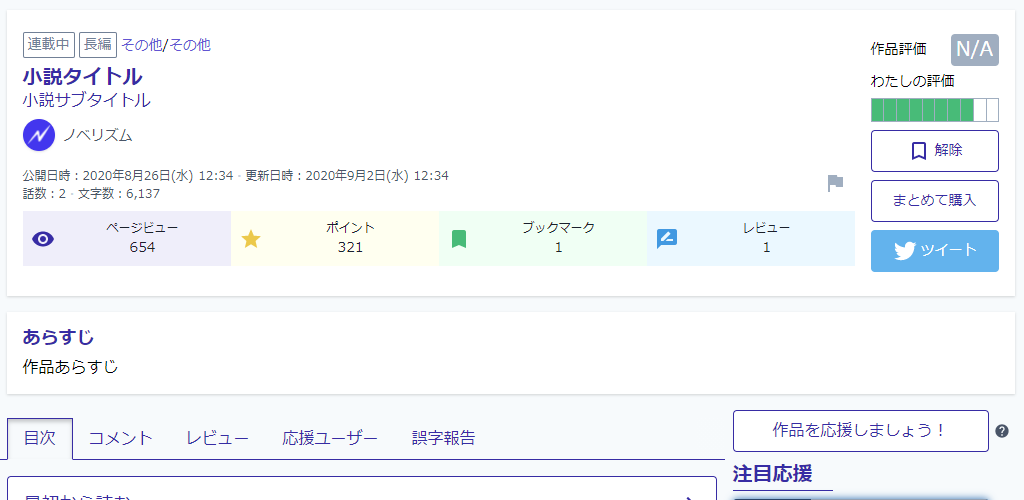 作品ページでは、作品のジャンルやタグ、あらすじなどの基本情報以外に、他のユーザーからの評価やコメント、応援も確認できます。