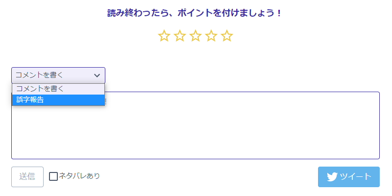 ※自分の作品に評価、レビューをつけることはできません。また、同様に自分の作品に応援をすることもできません。
