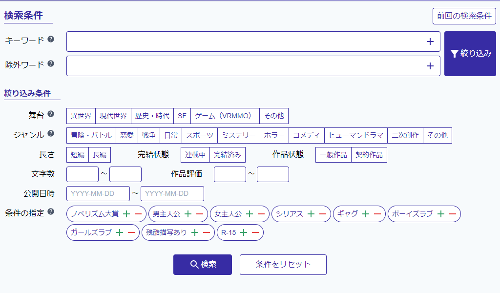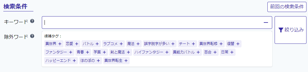 作品検索では、特定のキーワードを入力することで絞り込み検索、除外検索が可能です。お好みの作品を素早く検索することができます。