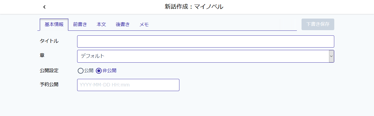 タイトルを入力いただき、「新章作成」で用意した章を選択し、公開設定と投稿日時をお選びください。章を設定しない場合は「デフォルト」の状態で続けてください。