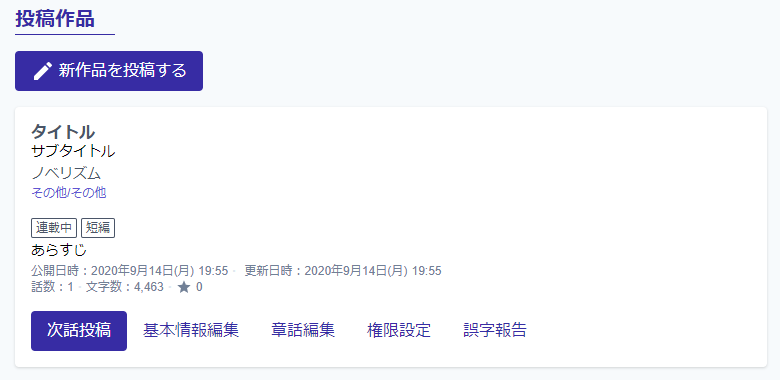 「新章作成」では作品の区切りに応じてお好みで章を設定を、「新話作成」では実際に作品の本文の執筆をすることができます。